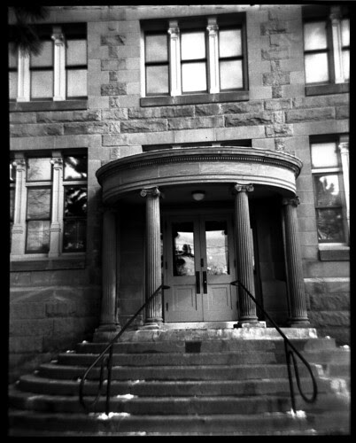 The high school has some fantastic exterior details surrounding its front door and windows! Of course, my friends thought I was an über-geek, photographing the building, but... Really, if my high school had looked this awesome, it would have made the experience that much better.